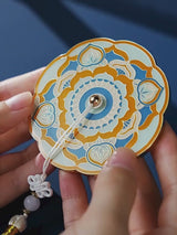 The round mirror, crafted from zinc alloy and glass, fits softly in your hand and features a delicately painted lotus motif—a symbol of purity and new beginnings. The elegant white tassel adds a touch of calm sophistication to your daily routine.