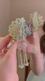 The soft curves and swirling cloud motifs evoke harmony and balance, fundamental to traditional Asian aesthetics. Accented by intricate gold filigree and vivid blue enamel, the design symbolizes prosperity and serenity, further enhanced by delicate jade-like beads and graceful teardrop stones hanging on fine chains—bringing an aura of timeless beauty to your hair.