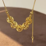 This necklace is a harmonious union of timeless Eastern tradition and modern refinement, designed for those who find meaning in symbols of abundance and spiritual depth. Inspired by the legendary Five Emperors’ coins, each golden disc is engraved with ancient characters that have symbolized prosperity, balance, and fortune in East Asian culture for centuries. As you move, the coins catch the light and subtly shimmer, echoing the circulation of energy, wealth, and harmony through your life.