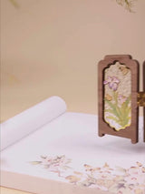 This miniature folding screen brings a sense of calm and elegance to any space, embodying the beauty of Eastern artistry and craftsmanship. Handcrafted from Black Walnut and Poplar, with subtle metallic and acrylic details, every panel tells a poetic story of nature’s balance and refined style. Delicate engravings of blooming flowers and graceful birds evoke the peaceful rhythm of time and tradition, making it more than just a decoration—it’s a symbol of enduring harmony.