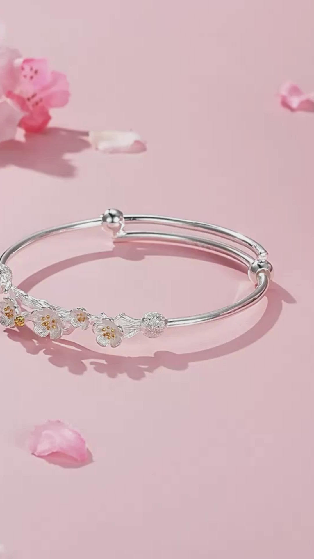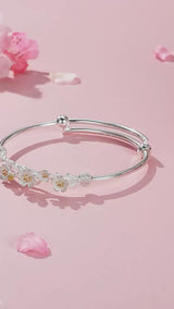 Each bloom is detailed with luminous gold and silver, symbolizing purity, prosperity, and new beginnings in many Eastern cultures. The intertwined branches convey resilience and harmony, a reminder of nature’s enduring vitality and calm. The soft band can be adjusted by gently pushing and pulling to fit wrist sizes ranging from an inner diameter of 54mm to 62mm, ensuring comfort, elegance, and a tailored experience for every wearer. With a weight of 16g, this bracelet is substantial yet feels light—a daily affirmation of grace and strength.